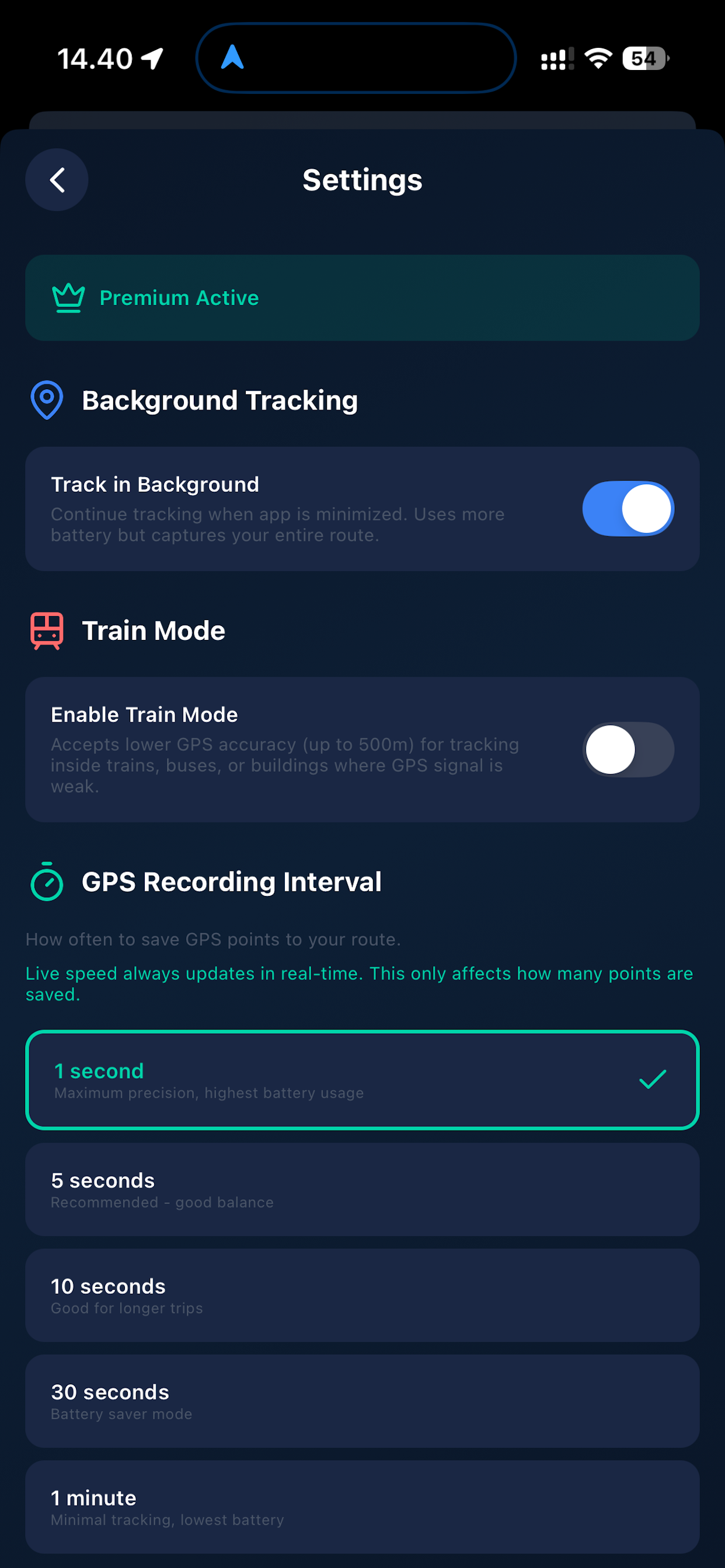 This is where you can enable “Track in background”, allowing the app to continue tracking if it is accidentally closed. This is also where you set the tracking interval used for stored routes in the timeline slider.