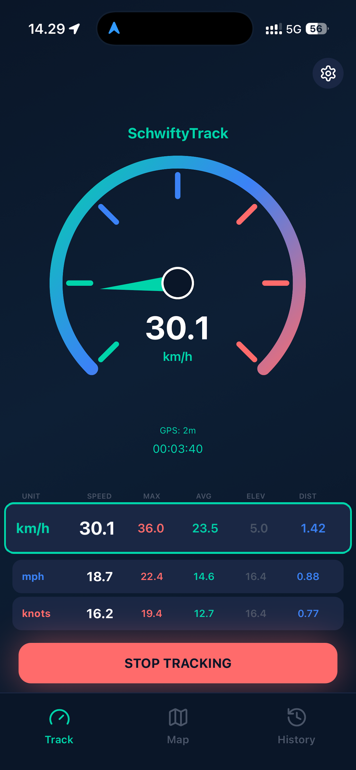 On the Tracking page, you can start and stop tracking. When you tap one of the three speed boxes, it moves to the top of the screen and the selected speed is shown in the speedometer.